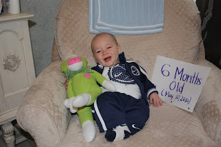 The major accomplishment during Reese's 6th month was that HE STARTED CRAWLING! It is an army crawl, but he is super fast. He makes it from our living room to kitchen before I can turn around. It is crazy to look down and see my baby boy patting my feet for me to pick him up while I'm cooking dinner. He is even crawling up into my lap if I am sitting on the floor. He really just keeps getting better and better! He has began reaching for me and crying for me when I leave the room. He also cries for me if he is tired. I must say that it melts me!